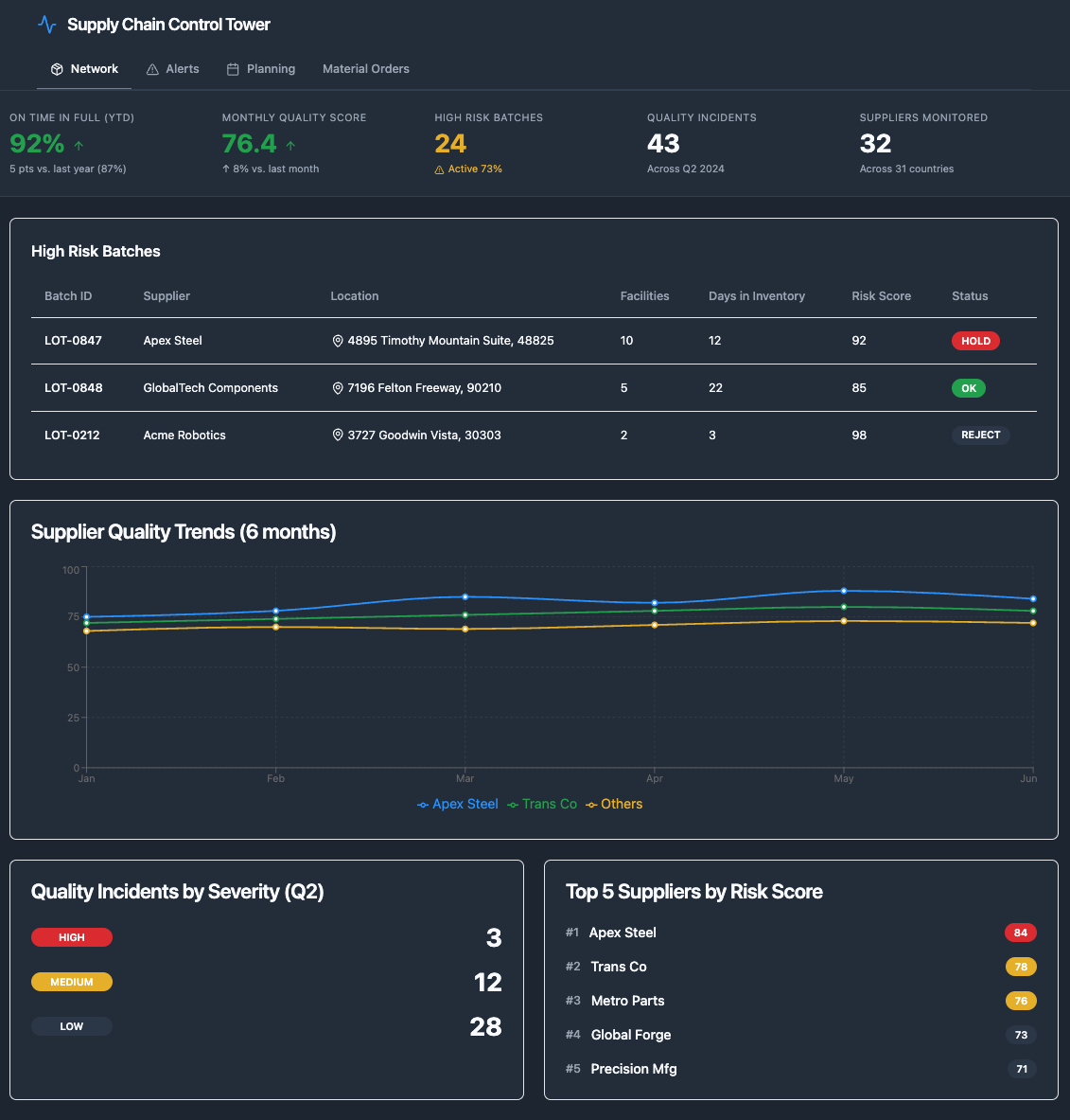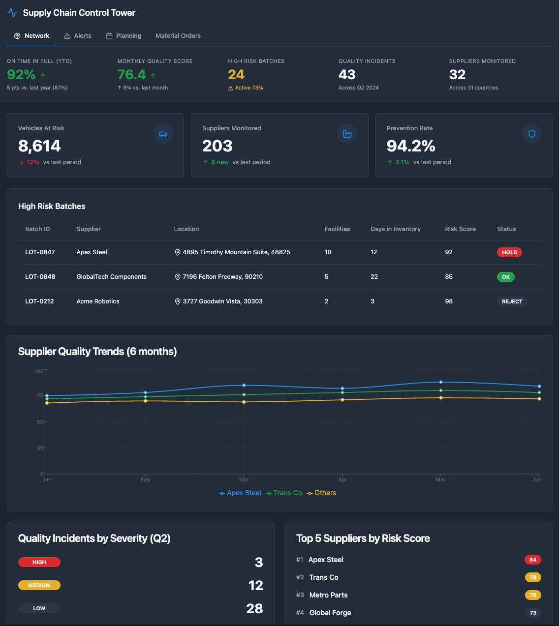 Deployment Strategist to AIP: "Create an executive quality dashboard for Sarah Chen. Show: (1) High-risk batches with affected vehicle counts, (2) Supplier quality trends over last 6 months, (3) Quality incidents by severity, (4) Top 5 suppliers by risk score. Make it filterable by date range and supplier."